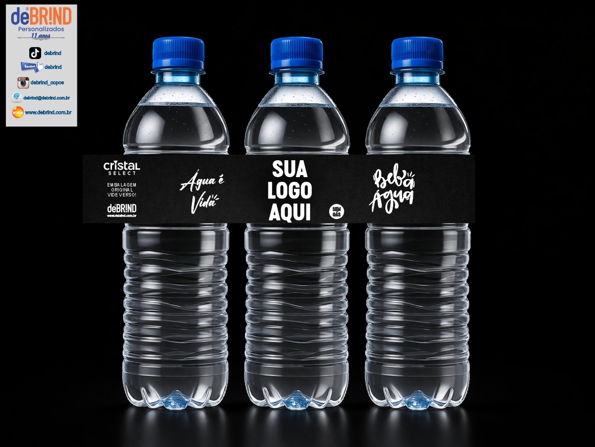 Com água pura e de alta qualidade, nossas garrafas recebem rótulos personalizados conforme o seu design, garantindo um toque exclusivo e elegante para qualquer ocasião.