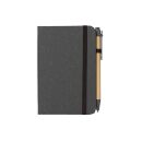 Caderneta ecológica de capa dura revestida em fibra de palha de trigo. Contém aproximadamente 80 folhas brancas com pauta, além de duas folhas de guarda, uma fita para fechamento e porta-canetas elástico. Acompanha uma caneta esferográfica de carga azul de 1,0mm com corpo em papelão e clip, acionamento por clique e ponteira em plástico.