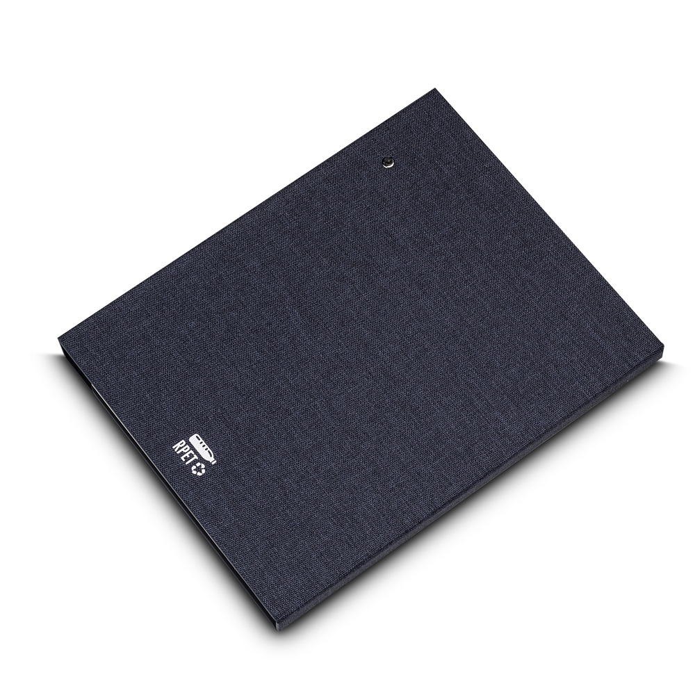 Caderno de anotações, capa em tecido RPET e detalhe em bambú com suporte para caneta na parte interna, miolo com 80 folhas pautadas.