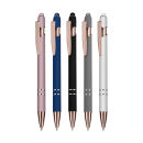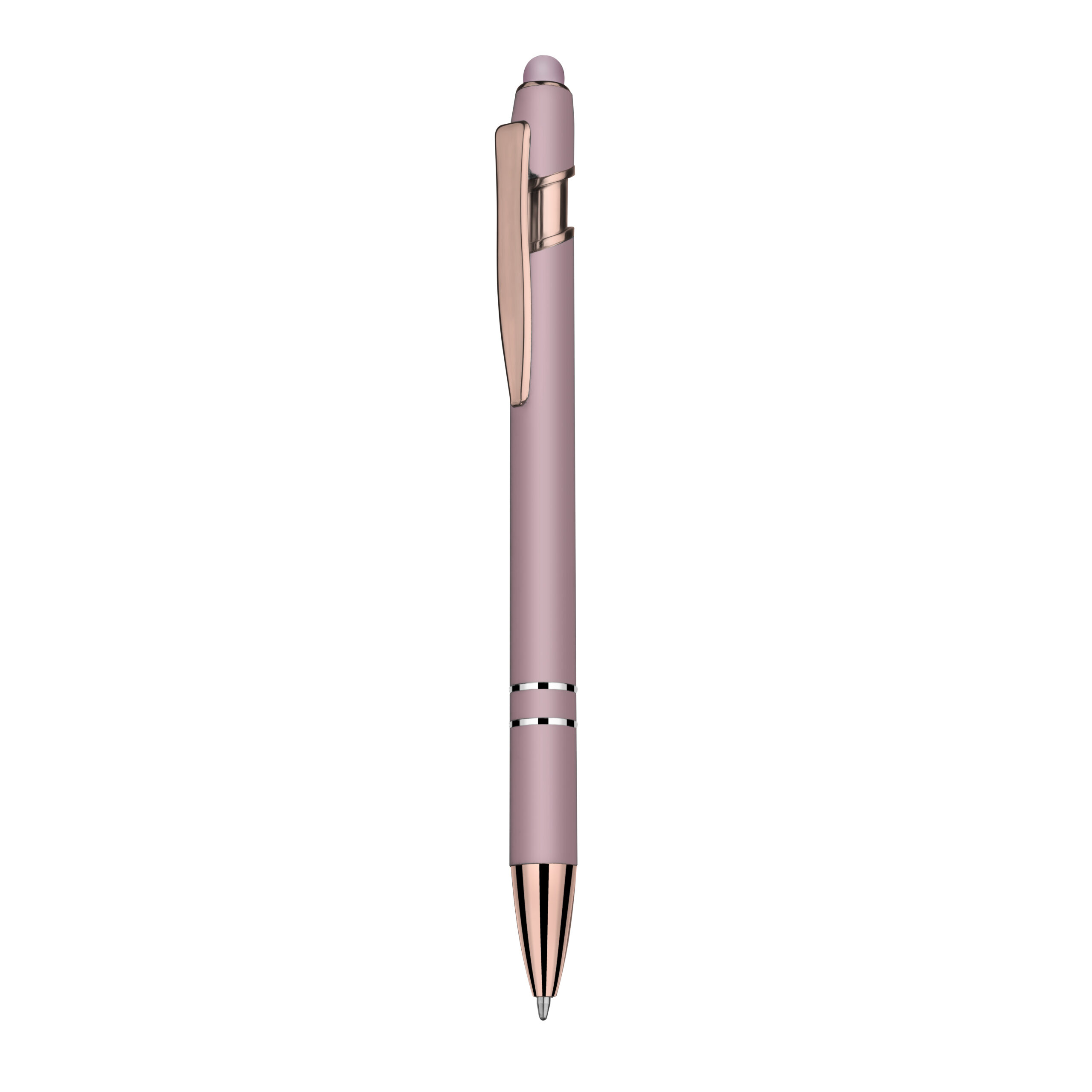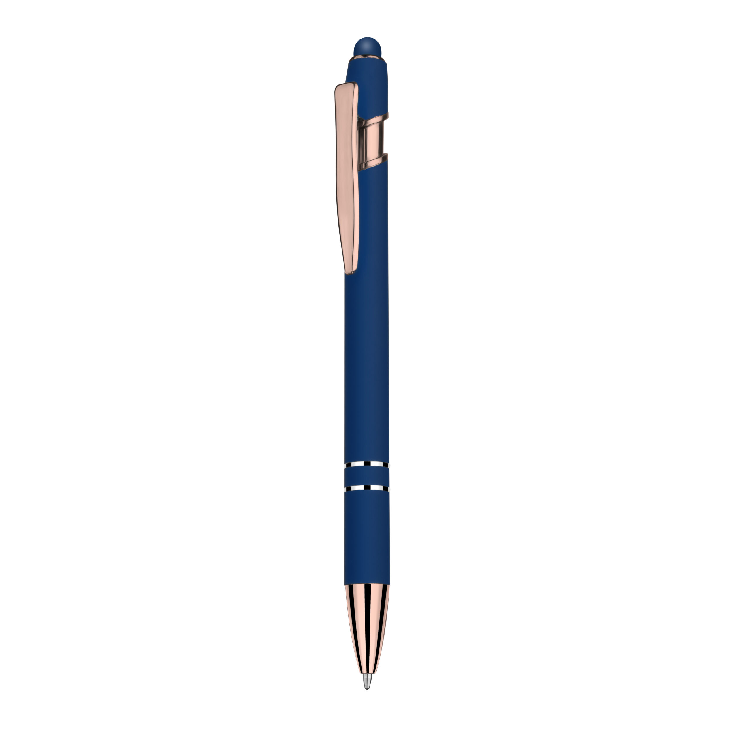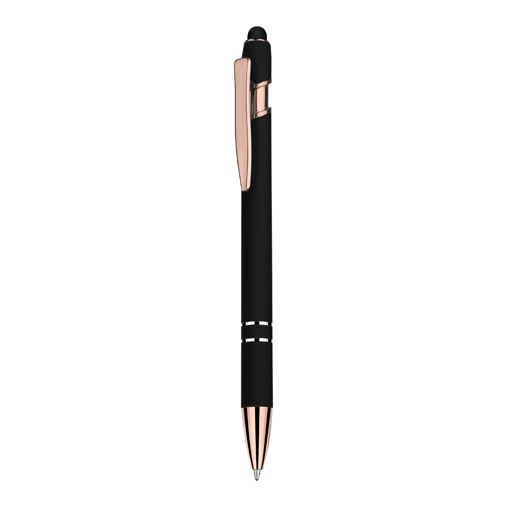 Caneta esferográfica em metal escrita em azul com cor fosca. Refil tipo parker com ponta touch emborrachada e detalhe dourado rose.
