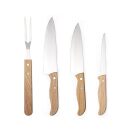 Kit churrasco 4 peças em estojo de madeira. Contém três facas e um garfo de inox com pegadores de madeira.