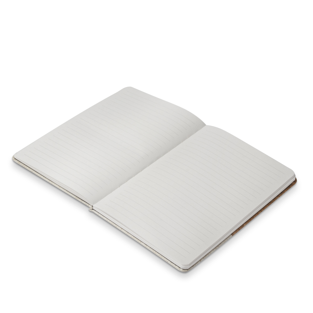 O caderno de anotações é feito de cortiça com detalhe em algodão cru, em capa dura com miolo 80 folhas pautadas.