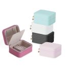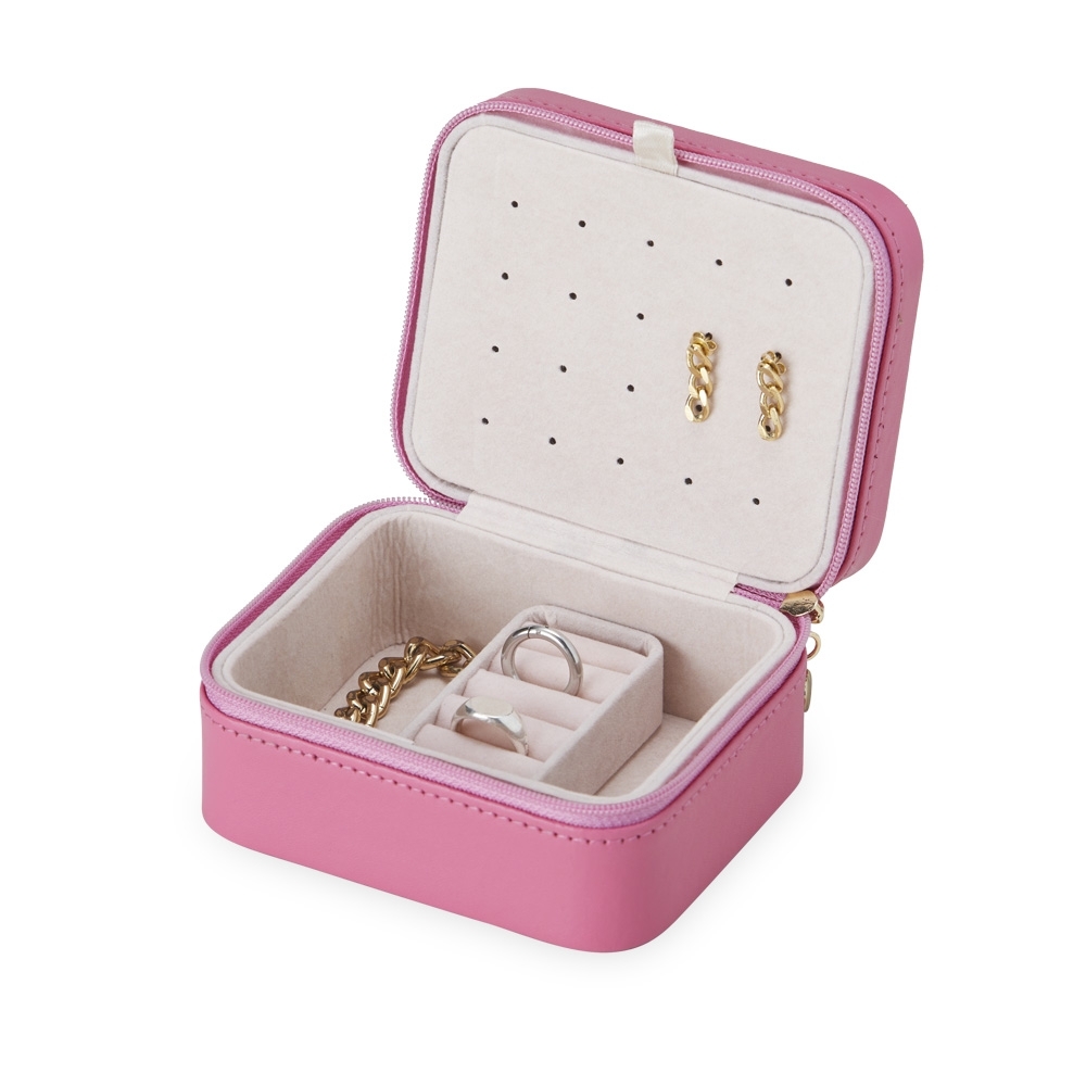 Porta-joias de couro sintético com revestimento aveludado. Possui compartimentos internos para anéis, brincos, pulseiras e colares.